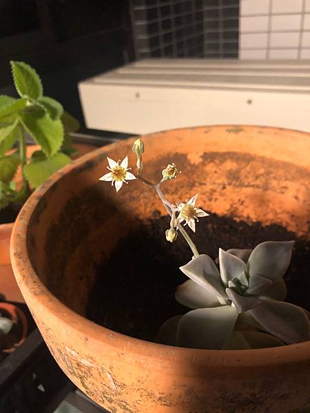 我家石蓮也開了兩朵小花,嬌小玲瓏的花朵上還有極細微的斑紋。我第一次看石蓮開花,從細細的枝芽上長出柔軟的小捲曲,再長出花苞,每天都有新變化。